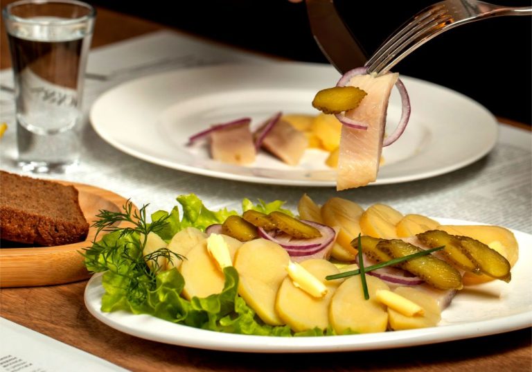 Īstena patriotu maltīte – kartupeļu salāti ar siļķi un āboliem