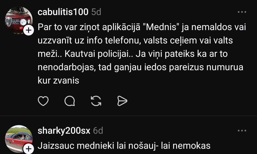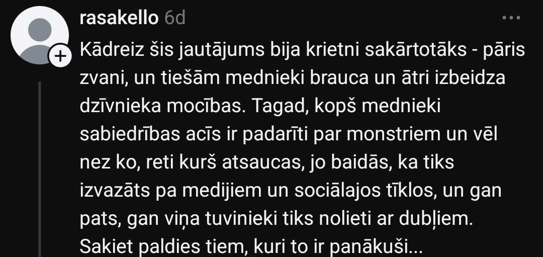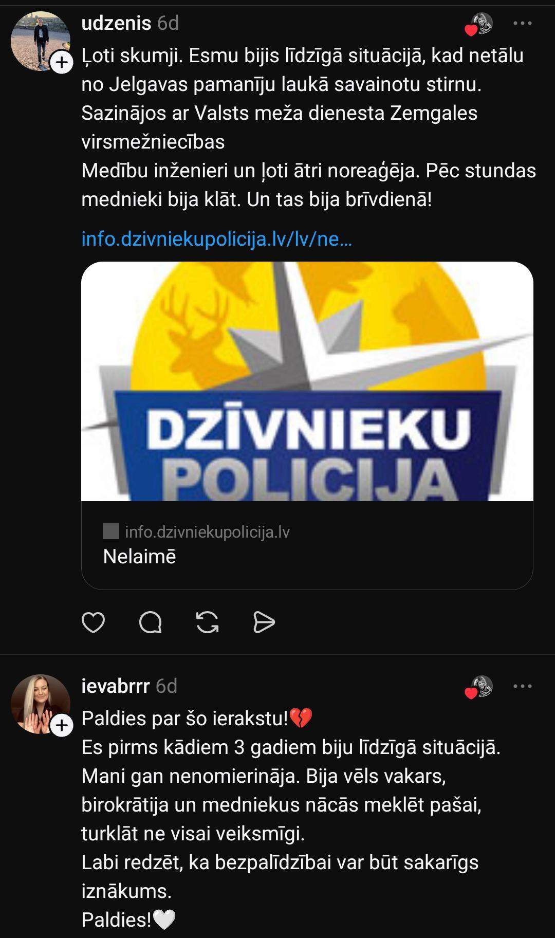 Gerda dalās pieredzē: “Kad man alnis izskrēja mašīnai priekšā, sazvanot 113, viņi paši sazinājās ar Meža dienestu un norīkoja mednieku. Atbrauca Meža dienests un mednieks. Izvērtēja situāciju un palīdzēja dzīvniekam nemocīties. Pēc tam savāca un aizveda. Vēl tagad atceros tos trīs šāvienus un asaras acīs.”