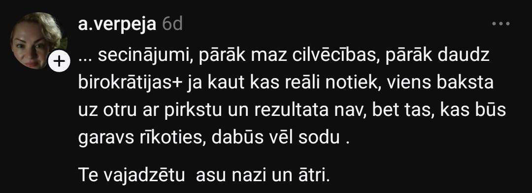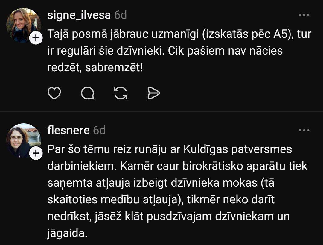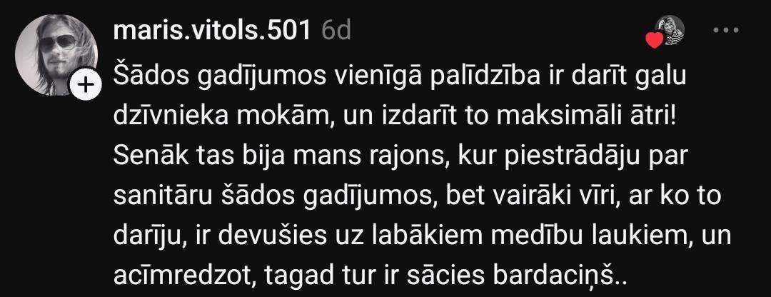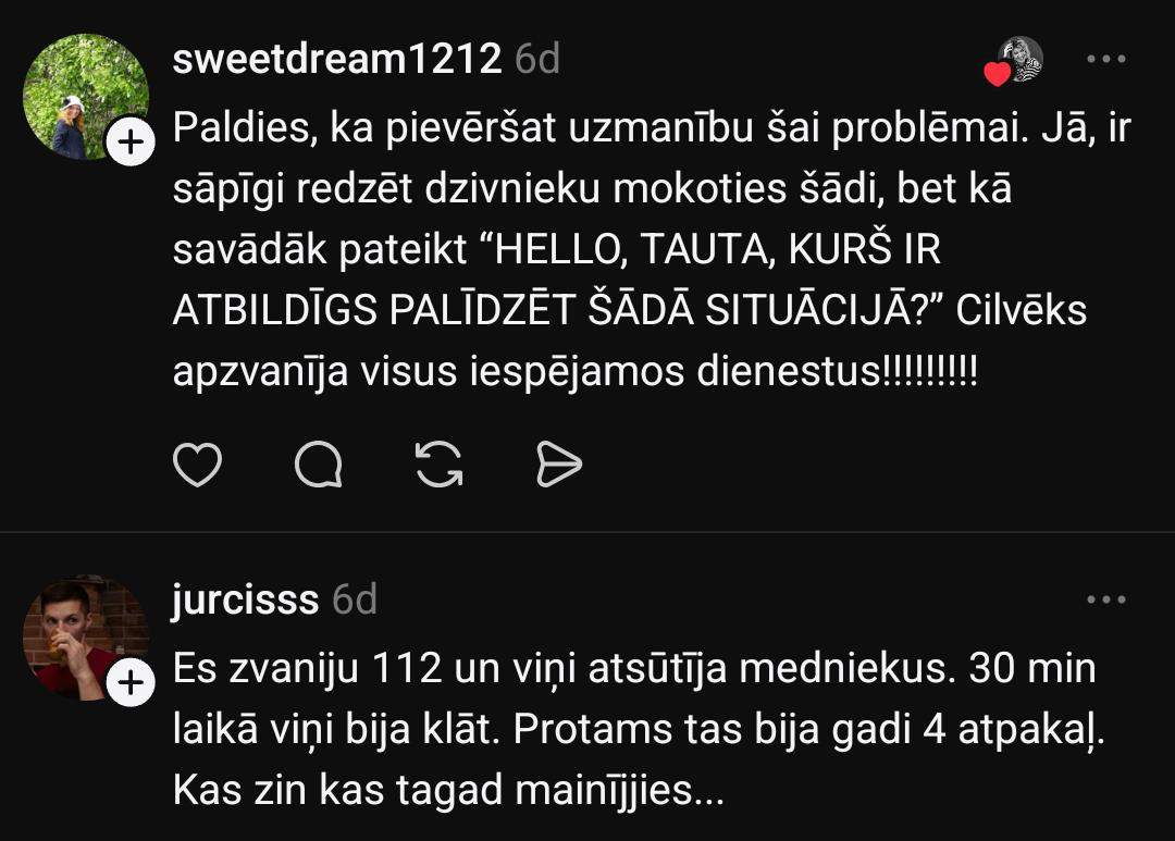 “Nabaga dzīvnieks. Es gan nepiekritīšu, ka situāciju nevajadzēja parādīt publiski, jo zināšanas un pieredze var noderēt citiem. Diskutabli, vai vajadzīgs video attēlojums papildus pašam stāstam, bet es, godīgi, nezinātu, ko darīt un kam zvanīt, tāpēc pasekošu līdzi, lai zinātu, ja kas līdzīgs reiz notiktu. Ceru, ka dzīvnieka mocības ir beigušās,” viņa paskaidro.