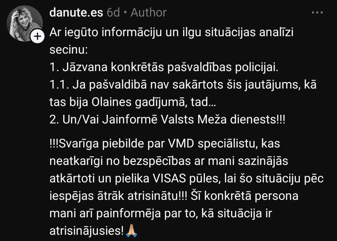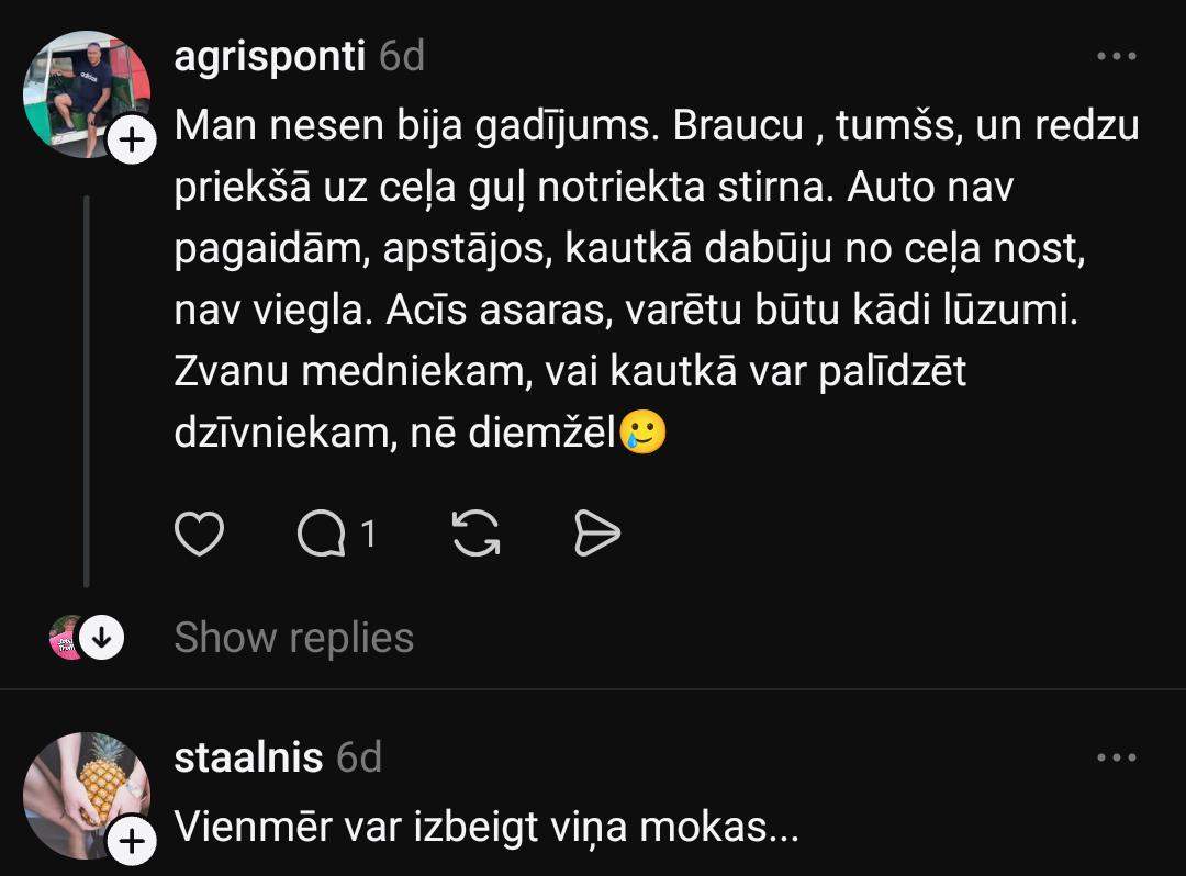 Danute raksta: “Kas ir bezspēcība? Tas ir tad, kad tu centies palīdzēt notriektam, mokās pamestam savvaļas dzīvniekam Olaines pagastā plkst. 6.49…