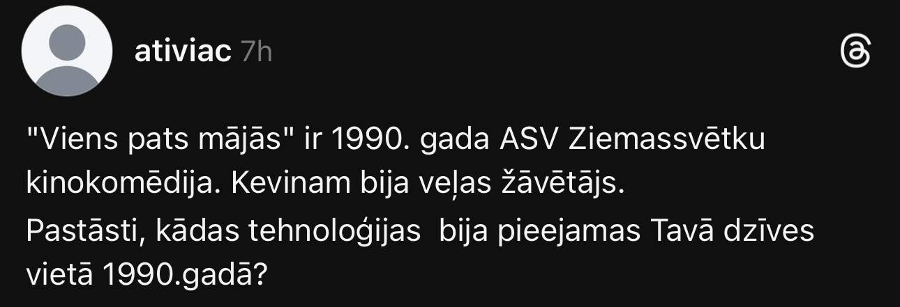 “”Viens pats mājās” ir 1990. gada ASV Ziemassvētku kinokomēdija. Kevinam bija veļas žāvētājs. Pastāsti, kādas tehnoloģijas bija pieejamas Tavā dzīves vietā 1990.gadā?” soctīklotājiem jautā Aivita.
