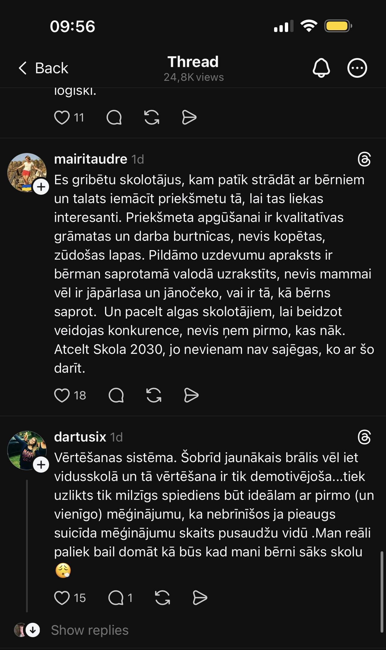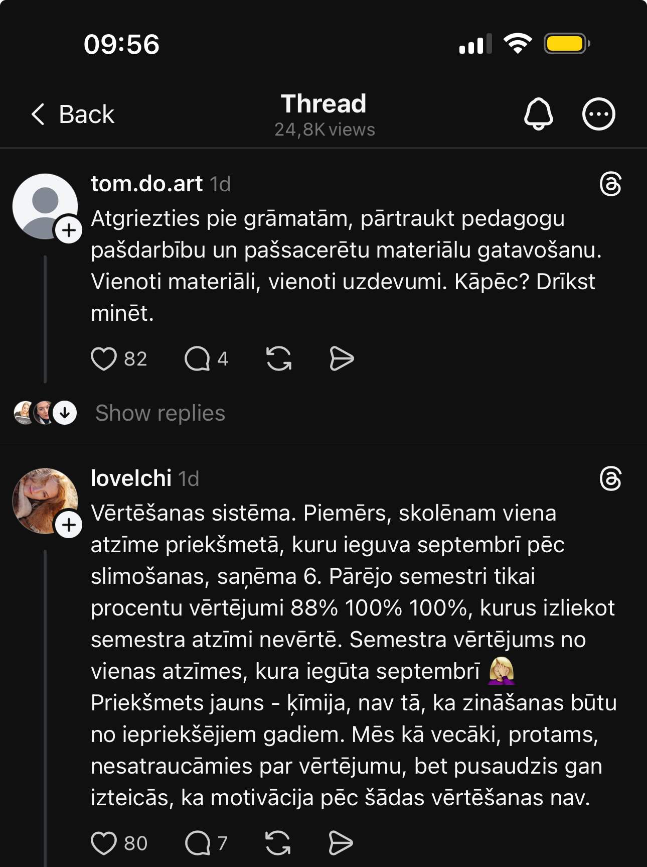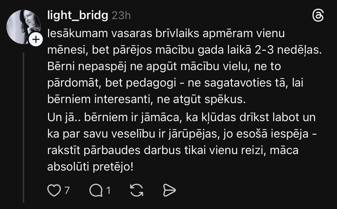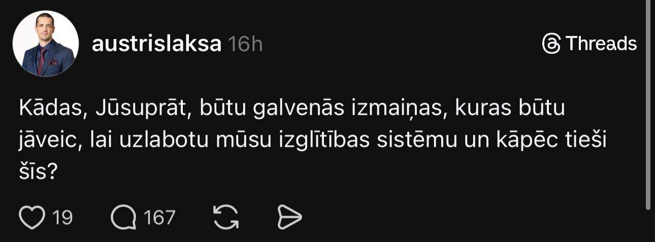 Par Latvijas izglītības sistēmu ikdienā dzirdamas neskaitāmas sūdzības – gan no vecākiem, gan pedagogiem, gan pašiem skolēniem. Tiek runāts par pārmērīgu slodzi, nepārdomātām reformām, motivācijas trūkumu un sajūtu, ka sistēma bieži vien nenāk par labu bērnu attīstībai, bet gan rada stresu un izdegšanu jau agrā vecumā. Sabiedrībā arvien biežāk tiek uzdots jautājums – kas īsti būtu jāmaina, lai izglītība Latvijā patiešām strādātu bērnu labā? Šādu jautājumu vietnē “Threads” uzdod arī kāds 12. klases skolotājs.