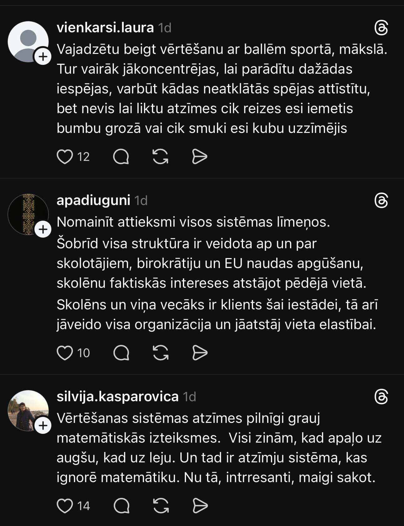 Vēl cilvēki min vecās sistēmas atgriešanu un uzsver, ka jāļauj labot vairākas atzīmes vairākas reizes. Vienlaikus tiek uzsvērts pārāk lielais priekšmetu daudzums.