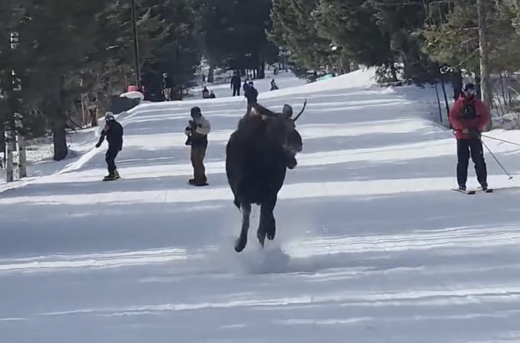Slēpotāji saulainā dienā laidās lejup pa Džeksonholas nogāzi Vaiomingā, ASV, līdz brīdim, kad trasē parādījās liels, aulēkšojošs alnis, kas uz brīdi aktīvās atpūtas cienītājos izraisīja nelielu paniku.