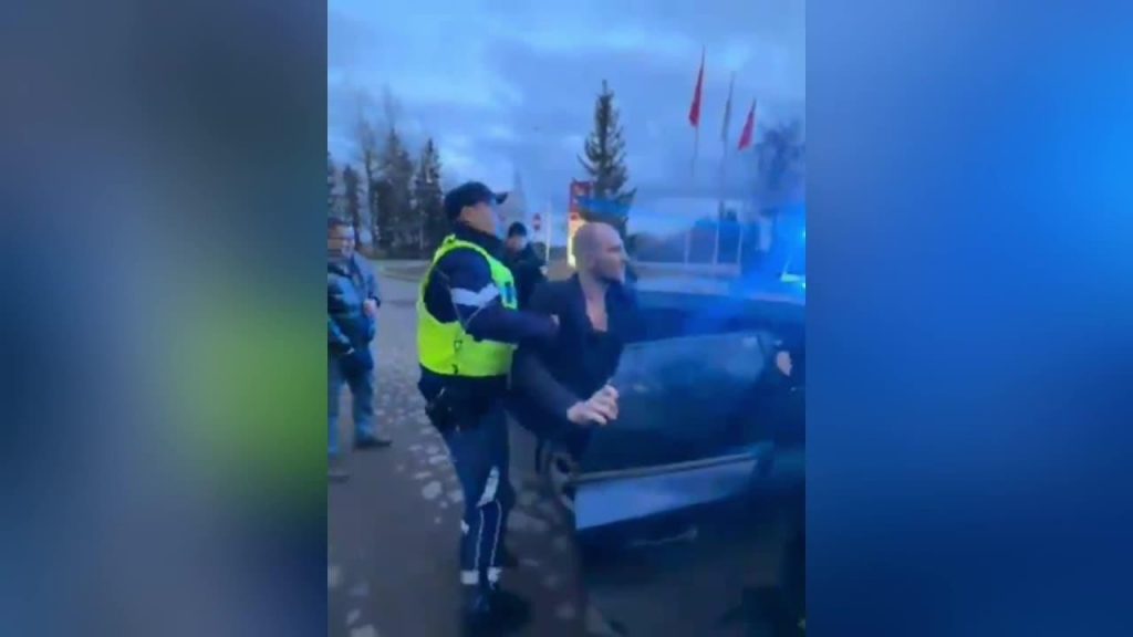 Vadītājs pretojas un ar rokām pieķeras pie automašīnas durvīm. Beigu beigās vadītājs izkāpj un policists aizved un iesēdina viņu policijas automašīnā.