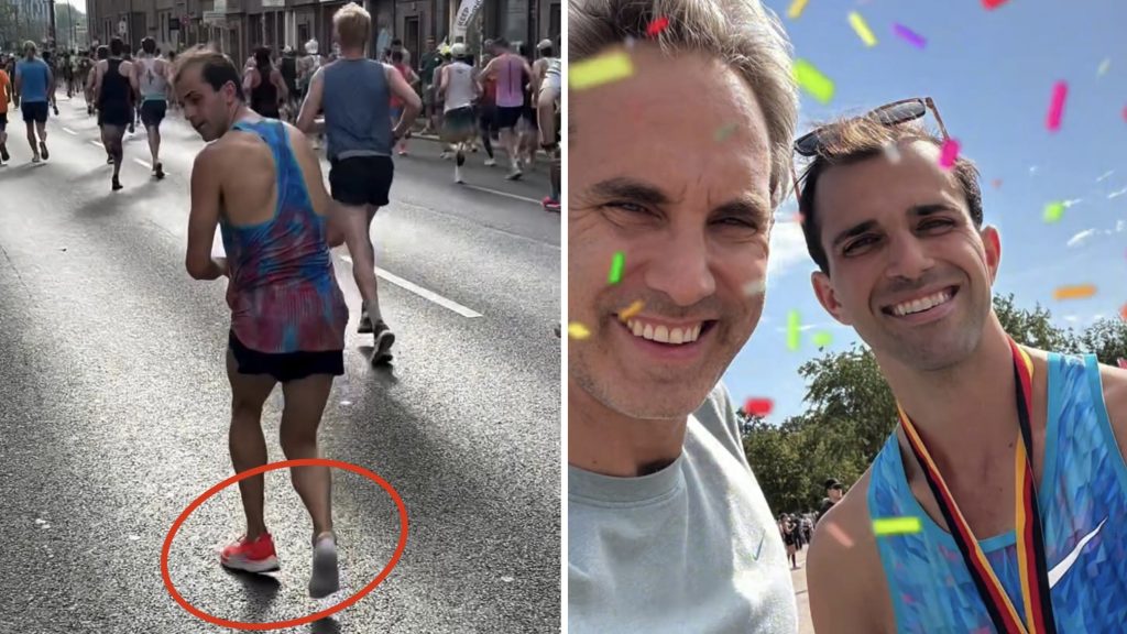 VIDEO. Berlīnes maratona dalībnieks finišē ar svešinieka apaviem kājās. Kas notika? 0
