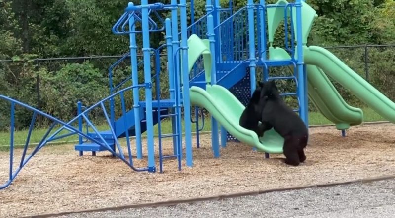 VIDEO. Bērnu rotaļu laukumā lāču mamma ar lācēnu spēlējoties šļūc pa slidkalniņu 22