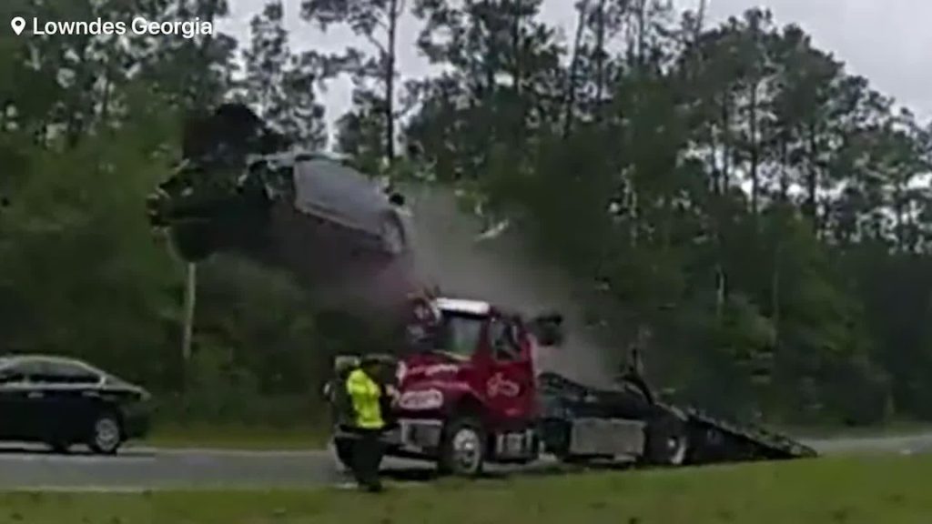 VIDEO. Brīnums, ka izdzīvoja! Autovadītāja lielā ātrumā uzbrauc uz evakuatora rampas un uzlido gaisā… 7