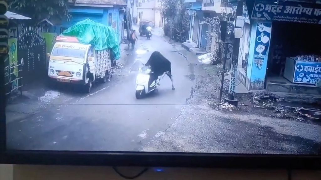 Smieklīgs video no Rišikešas, Indijā, rāda kuriozu situāciju, kurā iemūžināts bullis, kas nesteidzīgi soļo pa ceļu un nejauši uziet ielas malā novietotu motorolleru.
