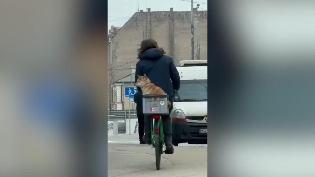 Tajā redzams šiba inu šķirnes suns sēžam kastē, kas piestiprināta uz velosipēda. Saimnieks stūrē velosipēdu – savukārt suns rātni sēž kastē un vēro apkārtni.