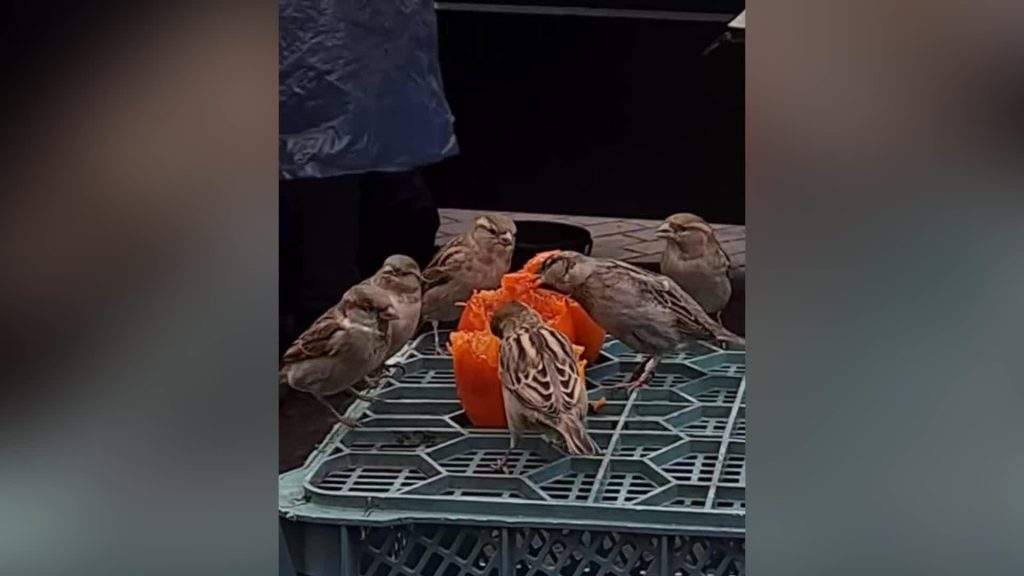 Kā redzams video, čivinātāji droši sasēduši uz plastmasas kastes, kur, tiek baudīti augļi.
