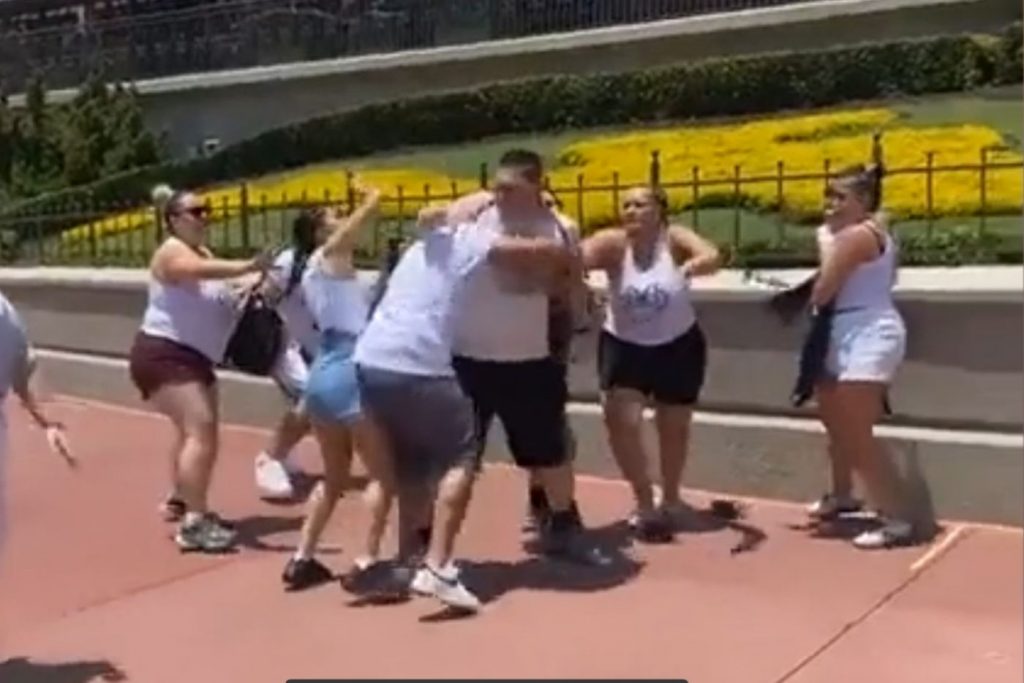 Sociālajos tīklos izplatītajā video redzams, kā viena ģimene ar dūrēm metas virsū otrai, viens vīrietis jau atrodas zemē izkārtnes priekšā, tikmēr Disnejlendas darbinieki sauc pēc papildspēkiem.