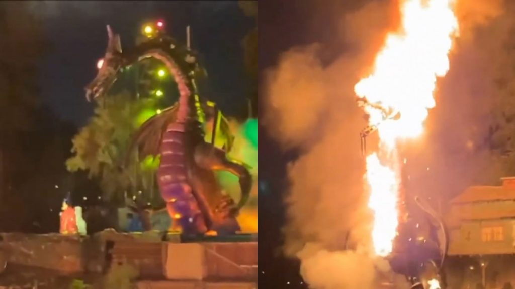 VIDEO. Disnejlendas šova laikā gigantisku pūķi apņem liesmas, skatītāji metas bēgt 6
