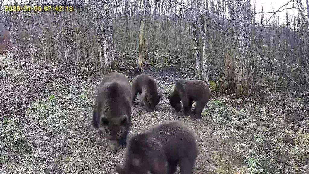 Igaunijā medību kamera iemūžinājusi uzmanību piesaistošu skatu – mežā manīta lācene ar trim lācēniem, kas savā nodabā meklē barību.