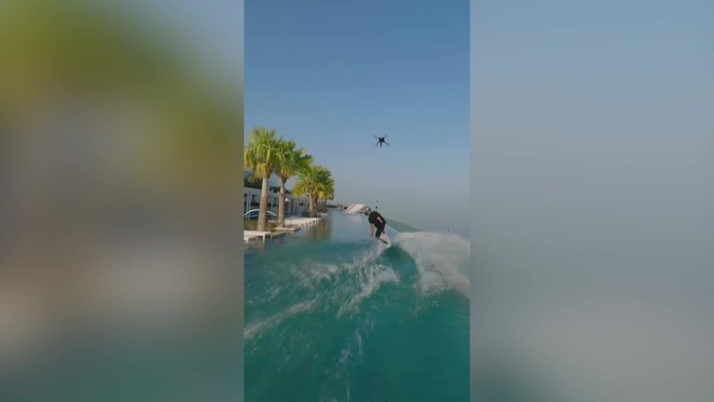 Video redzams, kā trīskārtējais pasaules “wakeskate” čempions Braiens Grubs aiz drona līkumo pa “bezgalības” baseinu, kas paceļas virs Dubaijas ainavas.