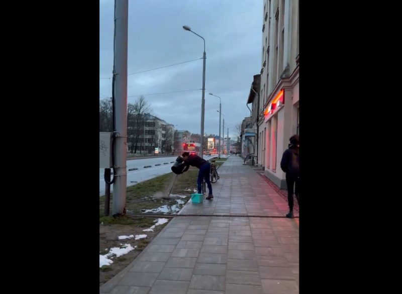 Video redzams, kā kāda sieviete cītīgi tīra un mazgā putekļsūcēju uz ielas un pēc tam visu saturu izgāž turpat uz ietves – apstādījumu daļā, kur aug zāle. Kad darbu paveica, viņa uzreiz iegāja “Rimi mini” veikalā, kas atradās turpat pretim. Visticamāk, sieviete ir šī veikala apkopēja, kura izskrējusi uz ielas izdarīt savu ikdienas darba pienākumu…Video redzams, ka viņa nebija ģērbusies āra drēbēs, rokās bija melni cimdi, kādus lieto, veicot saimnieciskos darbus.