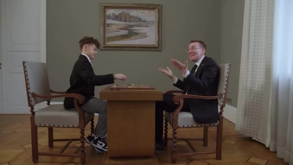 Sacīts – darīts! Abi satikušies Rīgas pilī, kur Edgars Rinkēvičs personīgi izvadājis Maksimu pa tās telpām, līdz beidzot nonākuši pie galvenā – vienas dambretes partijas izspēles.