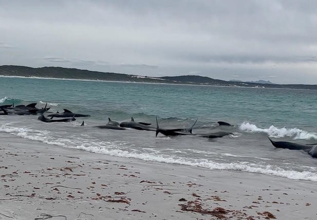 VIDEO. Gandrīz 100 melno delfīnu iestrēguši pludmalē Austrālijā 5