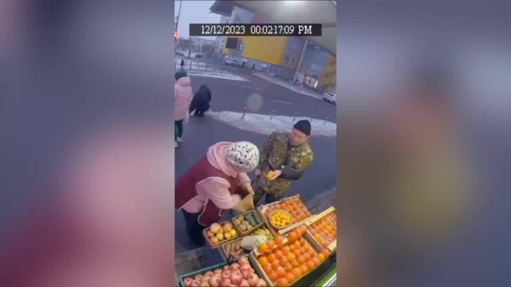 Video redzams traumas guvis ukraiņu karavīrs, kas rokās tur maisiņu ar iepirkumiem, taču karavīrs paslīd uz apledojušās ietves – maisiņš nokrīt un tajā esošie apelsīni katrs aizripo uz savu pusi.