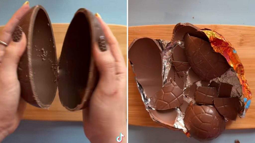 Viņš iesaka pavisam citu pieeju – olu nevajadzētu dauzīt, bet gan viegli atvērt gar tās savienojuma līniju, lai tā sadalītos divās glītās pusēs, tādējādi izvairoties no šokolādes drupaču veidošanās.