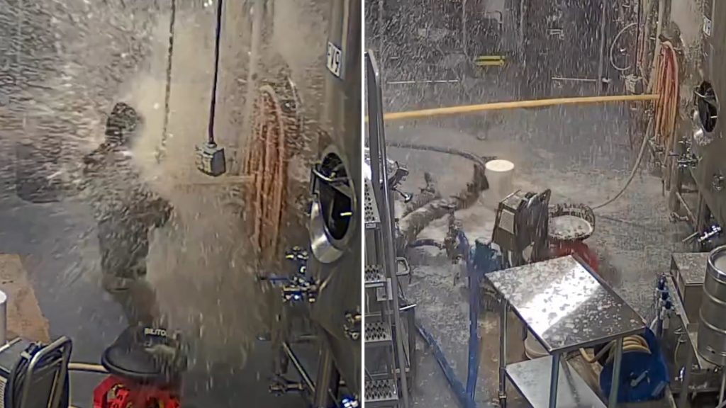 Bet tad pēkšņi no tvertnes izlaužas alus strūkla, kas ir tik spēcīga, ka nogāž darbinieku gar zemi.