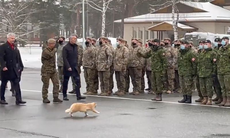 Vietnē “Twitter” video publicējis žurnālists Florians Neuhans (Florian Neuhann), pie tā pierakstot: “NATO ģenerālsekretārs pie kaujas grupas Ādažos, Latvijā. Tikai viens dzīvnieks nepakļaujas militārajai pavēlei.”