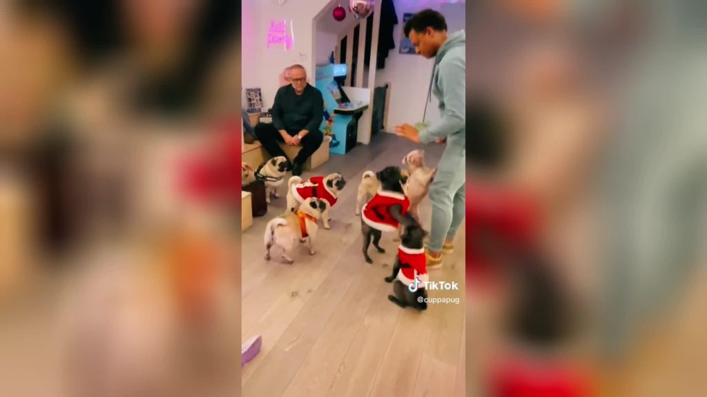 Kafejnīcā “Cuppa Pug” valda īpaša gaisotne – tur apmeklētājus sagaida vairāki izglābti mopšu šķirnes suņi, kas Ziemassvētku gaidās pārtop par Salaveča četrkājainajiem palīgiem.
