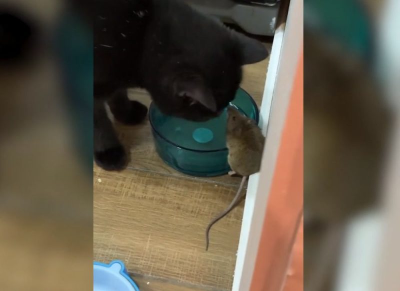 VIDEO. Kaķis atrod kopīgu valodu ar peli un ļauj tai padzerties no savas bļodiņas 15