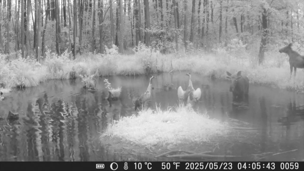Polijā kādu dzērvju ligzdu apciemoja jauns alnis kopā ar māti.