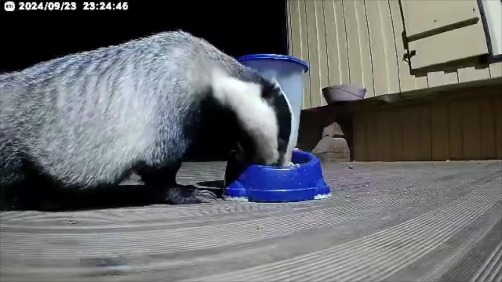 Pēc vairākām stundām, jau agrā nākamās dienas rītā, āpsis ir atpakaļ un turpina mieloties ar barību – uzpildes trauks nu ir atrauts no bļodiņas un ir pilnīgi tukšs.
