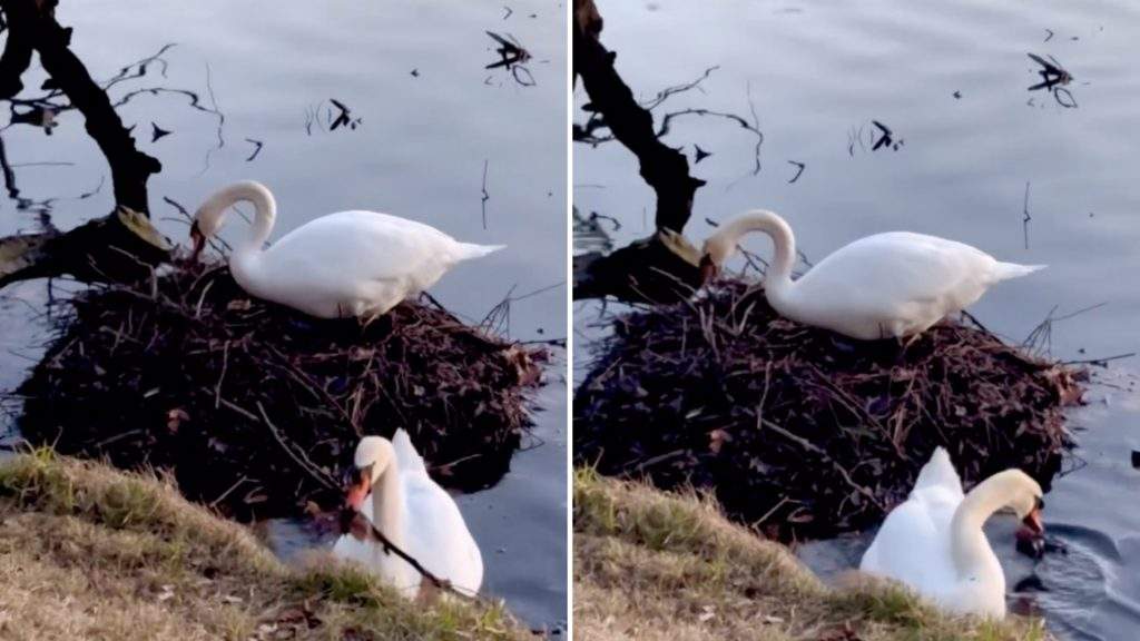 Vietnes “Threads” lietotāja Sanita dalījusies ar aizkustinošu video, kurā redzams, kā gulbju pāris kopīgi būvē ligzdu.