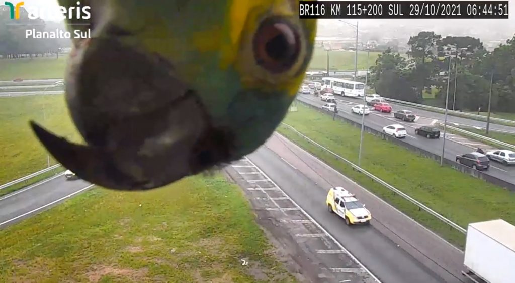 Kā ierasts, videonovērošanas kamera Kuritibas pilsētā, Brazīlijā, fiksējusi notiekošo uz šosejas līdz brīdim, kad uz tās uzlaidās papagailis un nolēma parotaļāties ar to.