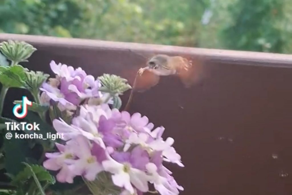 Viņa stāsta, ka kukainis atgādina kolibri putniņu un šis jau esot otrais vakars pēc kārtas, kad viņa to novēro pie saviem ziediem.