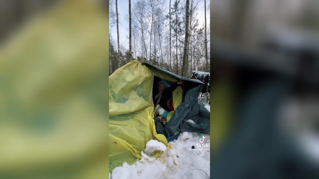 Artūrs Lapinskis “TkTok” vietnē dalījies ar kādu pārsteidzošu video par pāri, kas arī ziemas salā dzīvo mežā, ar plēvēm noklātā teltī.