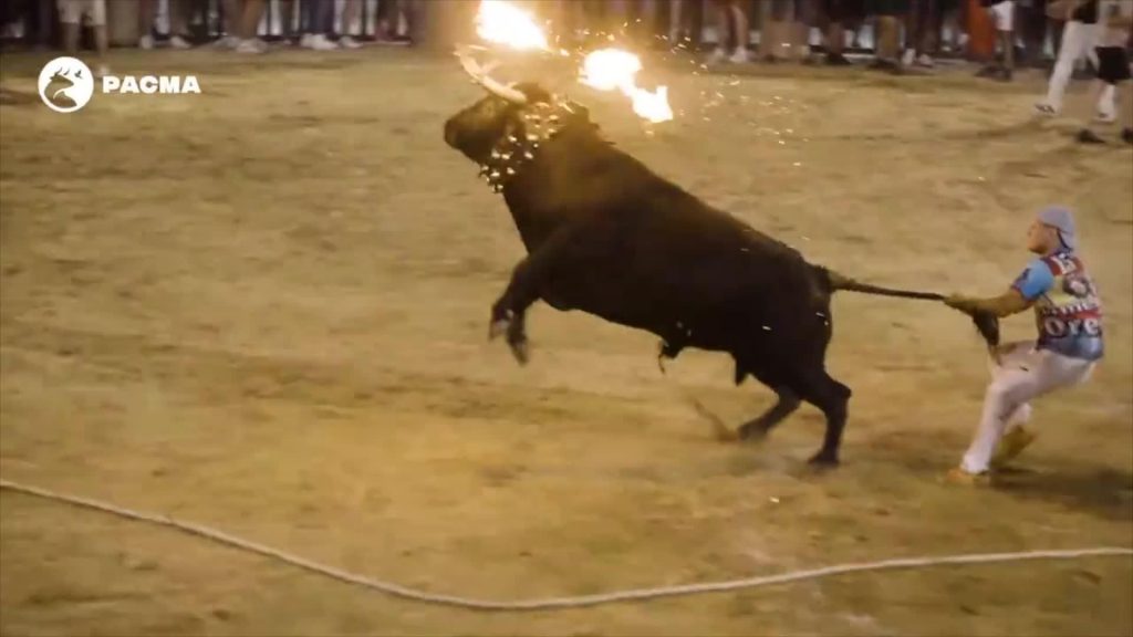 Vērsis ar liesmojošiem ragiem ir pazīstams kā “toro embolado” un tas ir skats, ko var redzēt daudzās Spānijas pilsētās vēršu skriešanas pasākumos.