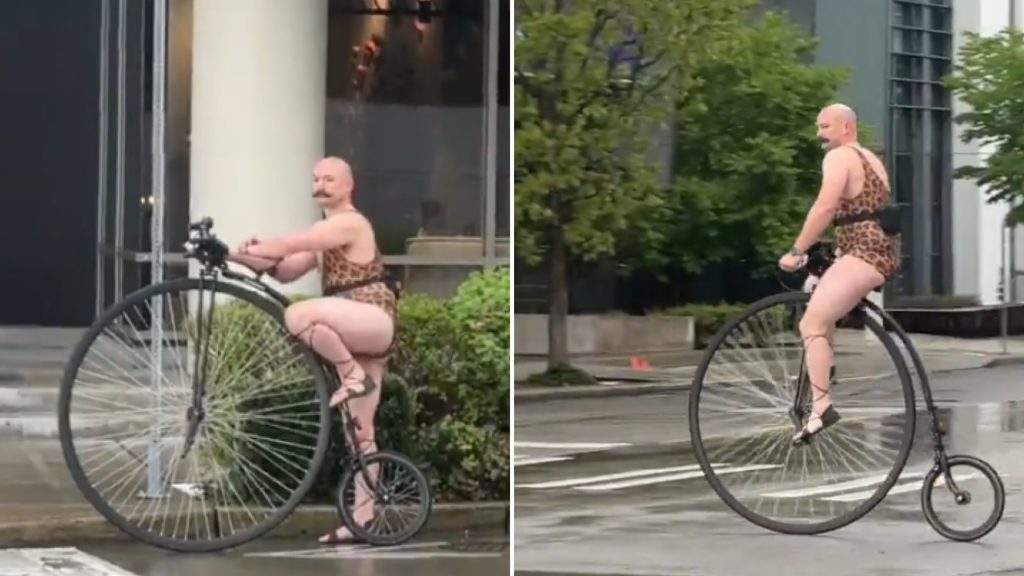 ASV pilsētas Sietlas iedzīvotājus pārsteidzis neparasts skats – lietainā laikā pa ielu brauca kāds vīrietis, tērpies vien leoparda raksta triko un pārvietojoties ar senlaicīgu velosipēdu.