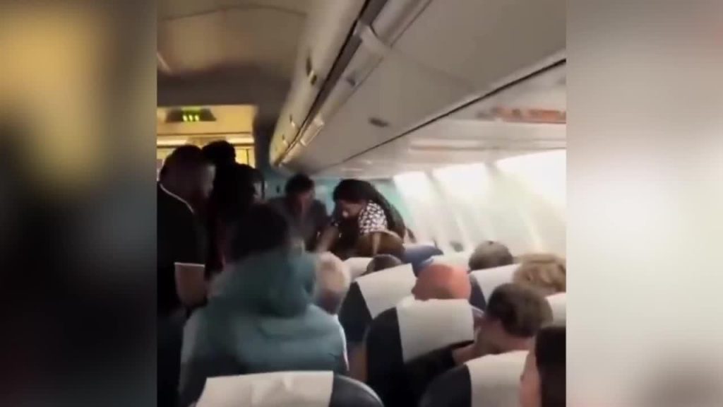 VIDEO. Lidmašīnas pasažiere aplej stjuarti, kura atsakās viņai izsniegt vēl alkoholu, pēc tam… noņem parūku un turpina strīdu ar citiem 14