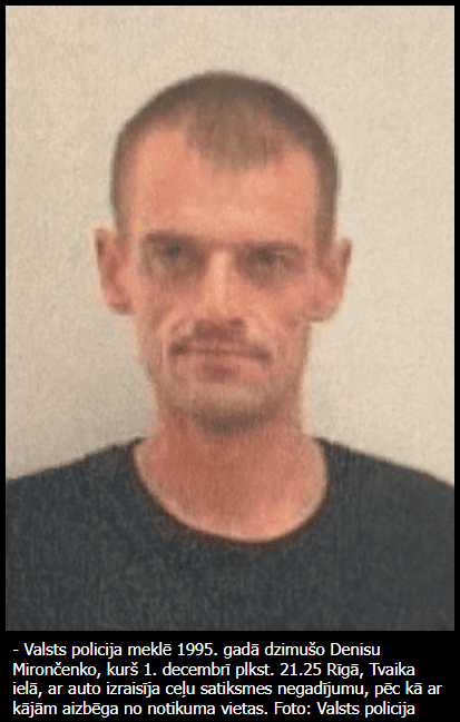 Pāris stundas vēlāk policija izplatīja paziņojumu, ka tiek meklēts 1995. gadā dzimušais Deniss Mirončenko, kurš 1. decembrī plkst. 21.25 Rīgā, Tvaika ielā, ar auto izraisīja ceļu satiksmes negadījumu, pēc kā ar kājām aizbēga no notikuma vietas.