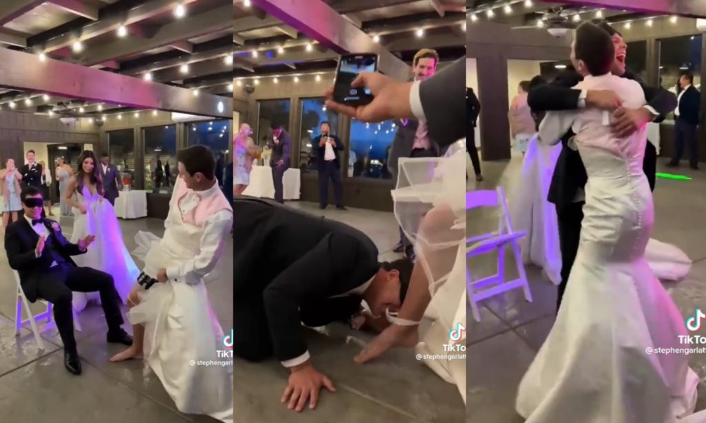 Kāzu viesu uzņemtajā video redzams, kā līgavainis sēž ar aizsietām acīm. Viņam priekšā stāv viņa labākais draugs, kurš tērpies baltā kleitā – blakus smieklus valda īstā līgava.