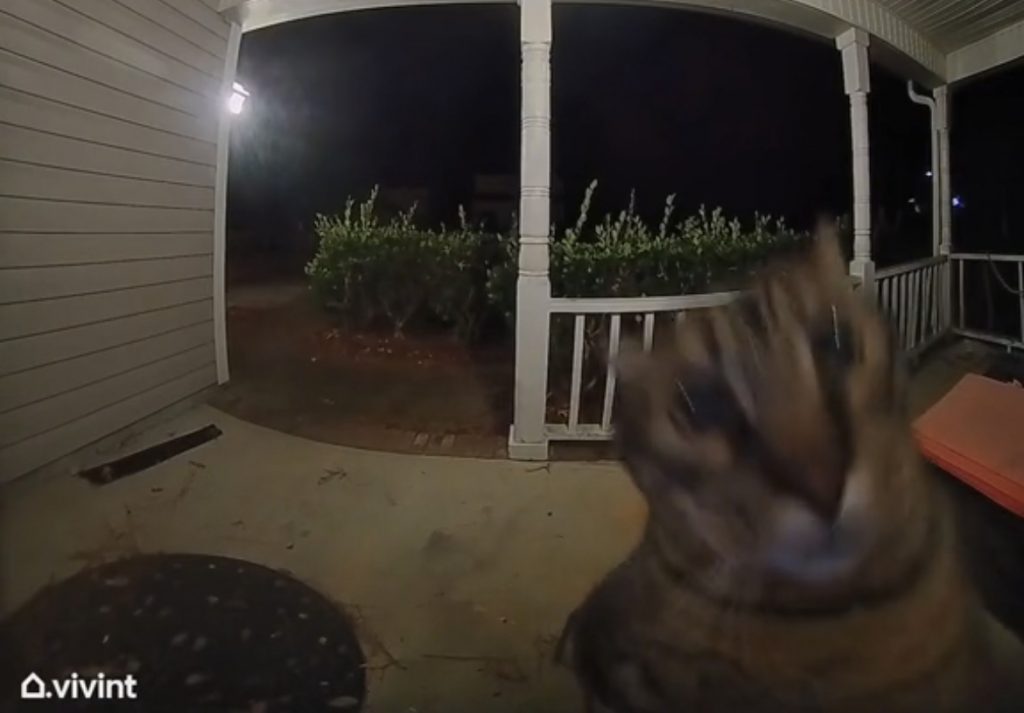 Kaķis uzlec uz neliela galdiņa, kas atrodas uz lieveņa, pieceļas pakaļkājās, pieliek purniņu pie kameras un ar ķepu piesit durvju zvana pogai.