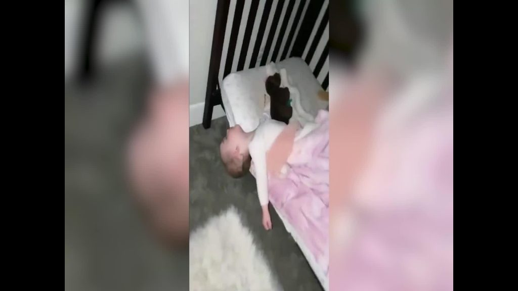 Pirmajos kadros redzams, ka bērns vēl guļ gultiņā, nākošajos kadros meitenīte jau pa pusei ir izkāpusi no gultiņas un aizmigusi uz grīdas.