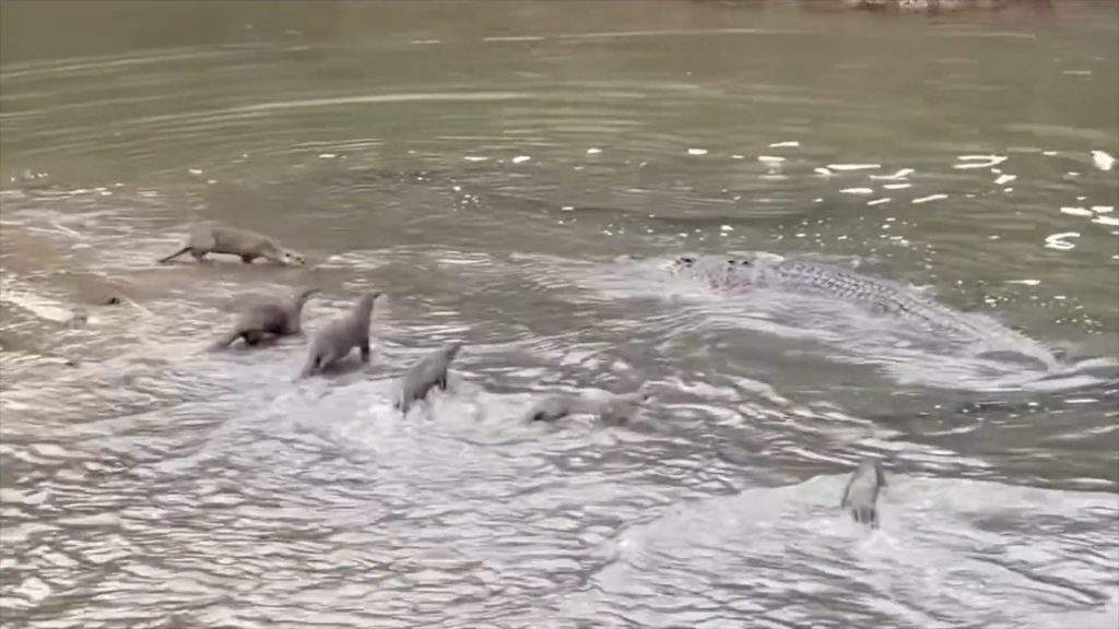 Kadros redzams, kā sešu ūdru grupa ielenc daudz lielāko plēsēju un, čivinot, piesardzīgi tuvojas tam, pēc tam atkal atkāpjoties. Krokodils vairākkārt mēģina uzbrukt, strauji verot žokļus, taču ūdri veikli izvairās no katra uzbrukuma.