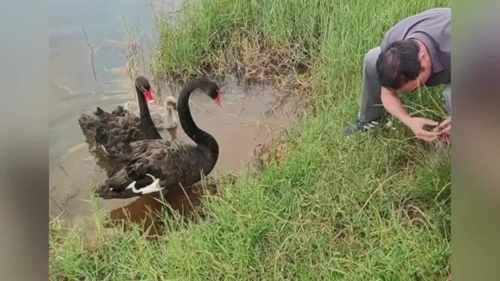 VIDEO. Melno gulbju ģimene “lūdz palīdzību” cilvēkiem, lai glābtu savu mazuli 0