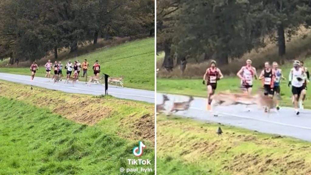 Aculiecinieks Pols Hilns sociālajos tīklos publicējis videoklipu, kurā redzams, kā apmēram 15 brieži traucas pāri ceļam, bet pārsteigtie maratonisti turpina skriet, nespējot noticēt savām acīm.