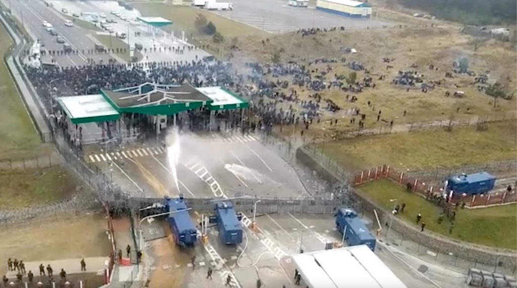 Polijas Aizsardzības ministrijas pārstāvji publicējuši vairākus video, kuros redzams, kā migranti ar akmeņiem un koka sprunguļiem apmētājuši Polijas robežu apsargājošos karavīrus, robežsargus un policistus. Tie reaģējuši ar asaru gāzi un ūdens lielgabalu.