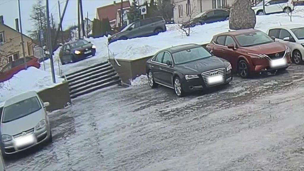 Jehvi policijas iecirkņa novērošanas kamera fiksējusi brīdi, kad kāds kungs, braucot ar “Volkswagen” automašīnu, nezināmu iemeslu dēļ nobrauca pa taisnāko ceļu tieši pie Jehvi iecirkņa ieejas. Taisnākais ceļš izrādījies gājējiem domātās kāpnes.