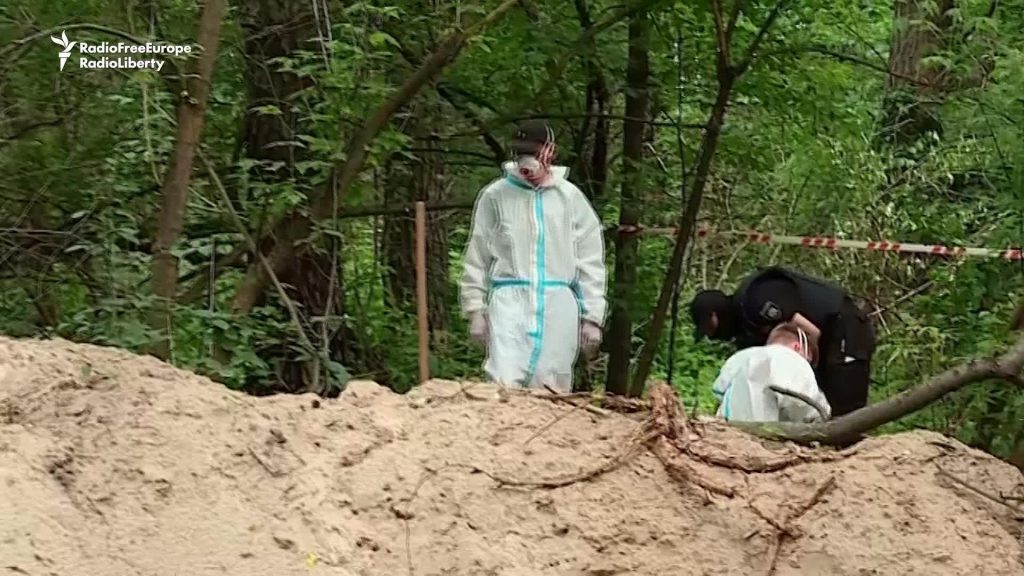 “Cilvēki tika spīdzināti, nogalināti un aprakti šādās bedrēs. [Tas ir] apmēram 40 gadus vecs vīrietis. Viņa rokas bija sasietas ar lenti aiz muguras. Redzams, ka viņam iešāva ceļgalā un galvā. Tas ir vēl viens Krievijas armijas noziegums – Kijivas reģionā ir atrasti 1316 nogalinātu un spīdzinātu cilvēku līķi. Šeit tagad strādā eksperti un izmeklētāji. Viņi nosūtīs līķus uz morgu speciālā transportierī. Kriminālistikas brigādes un kriminālpolicija turpinās izmeklēšanu morgos. Viņi mēģinās identificēt līķus. Ja tas nav iespējams, viņi ņems DNS paraugus un ievietos datubāzē identifikācijai nākotnē,” skaidro Ņebitovs.