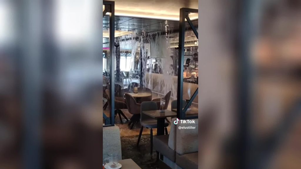 Kāds no kuģa pasažieriem vietnē “TikTok” dalījies ar video no brīža, kad kuģa bārs sācis applūst plīsušas caurules dēļ.