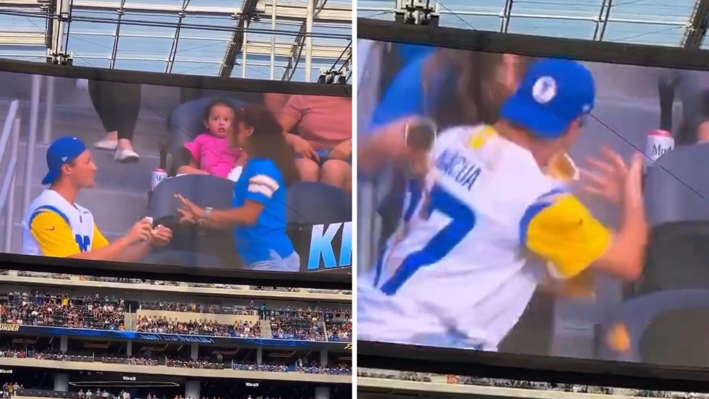 Video, kas ieguvis lielu popularitāti sociālajos tīklos, redzams kāds vīrietis “Rams” komandas krekliņā, kurš sākumā, šķiet, skatās savā mobilajā telefonā, taču tad pieceļas kājās no sēdvietas un nometas uz viena ceļgala sievietes priekšā pēc tam, kad pāris tika parādīts “skūpstu kamerā” amerikāņu futbola spēles laikā.