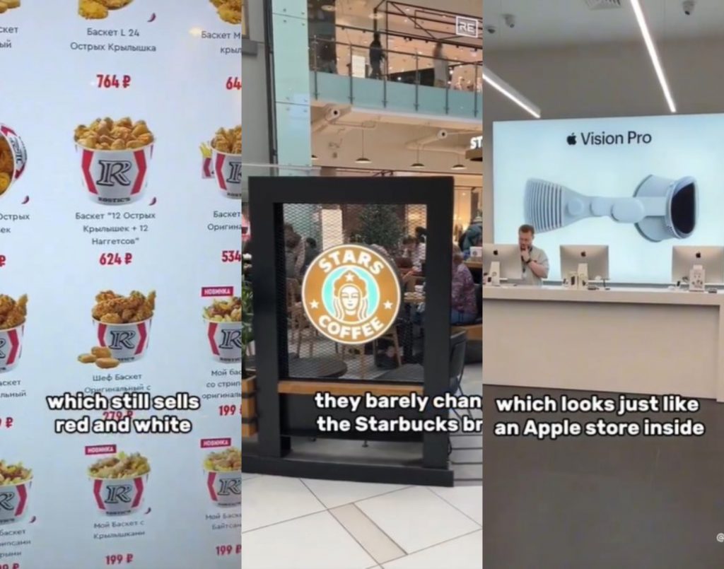“Lego” klucīšus tagad Krievijā var nopirkt “Cube World”, tāpat pārsauktā ēstuvē, kuras logo tāpat ir palicis liels M burts pieejami “McDonald’s” ēdieni, “Rostic’s” pārdod “KFC” vistiņas, “Timberland” zābaki atrodami “Bootwood”, tāpat atrodamas “Starbucks”, “Nike”, “Pandora” un citu zīmolu preces.